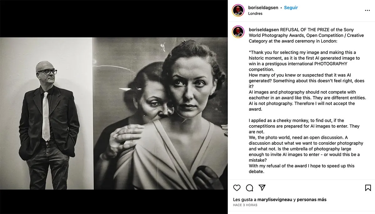 “¿Cuántos de ustedes sabían o sospechaban que era generada por IA? Algo acerca de esto no se siente bien, ¿verdad? Nosotros, el mundo de la fotografía, necesitamos una discusión abierta, sobre lo que queremos considerar fotografía y lo que no. ¿El paraguas de la fotografía es lo suficientemente grande como para invitar a las imágenes de IA a entrar, o sería un error? Con mi rechazo del premio espero acelerar este debate”.
